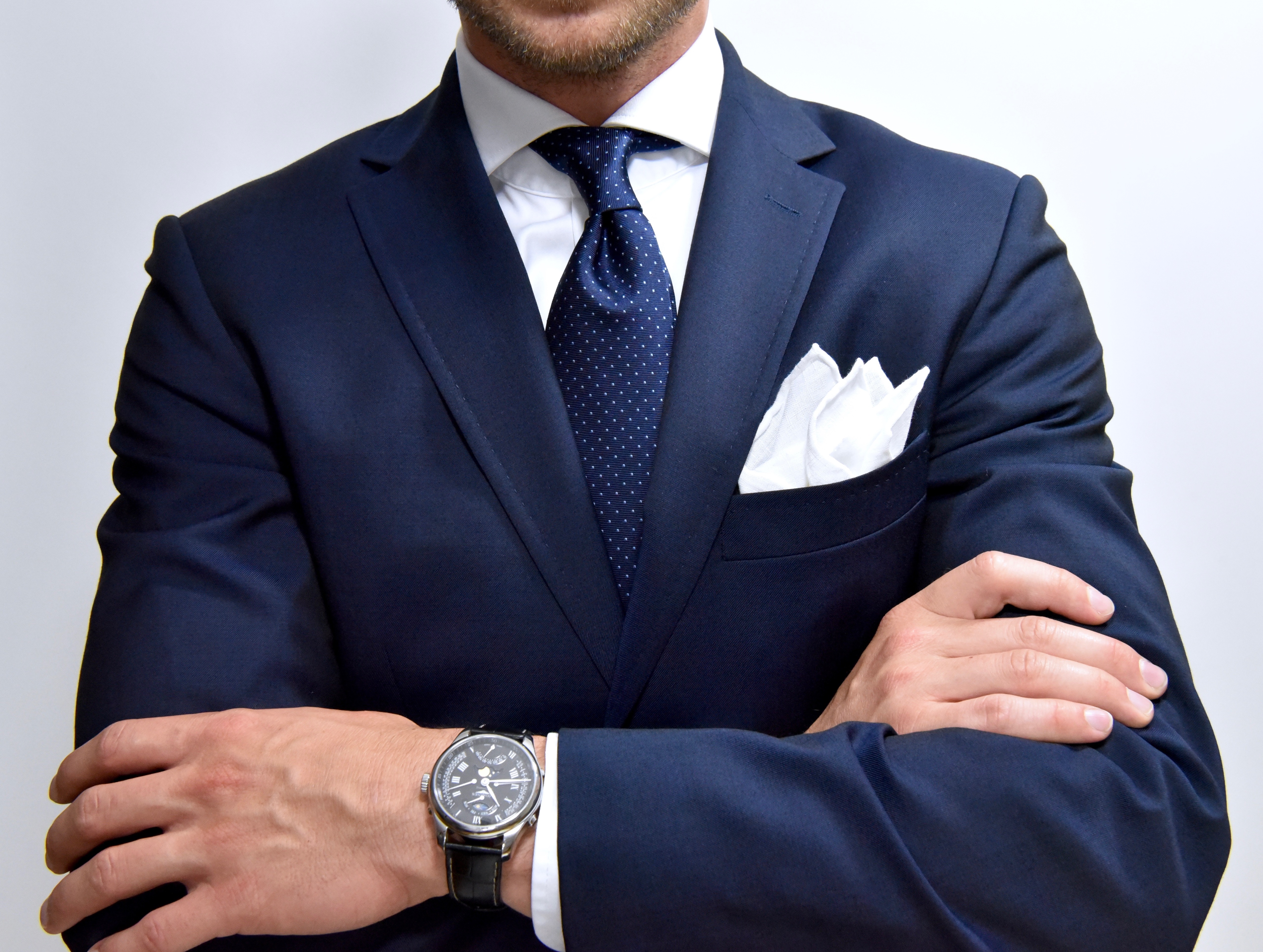 Poszetka? Najlepiej biała, ułożona w klasyczny TV fold. Można oczywiście postawić na coś mniej standardowego, ale ważne, by unikać pasteli, krzykliwych kolorów i skomplikowanych wzorów. Bardziej odważna, wzorzysta poszetka zadziała tylko wtedy, gdy naprawdę dobrze czujesz się w męskiej modzie i wiesz, jak to ograć.